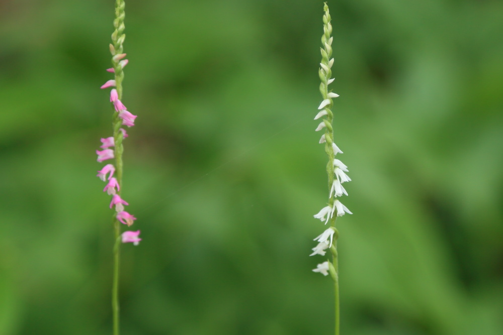 今夏、ぶどう棚の下に置いてある鉢植えの棚に、今年も元気いっぱいにネジバナが顔を出した。種が飛ぶのか、あちこちの鉢から伸びている。早いものは7月上旬には咲き始めた。その中に、何やら白いままの蕾が見えた。この花はピンクになる前の咲き始めは白っぽいものが多い。たぶんそれだろうと、あまり気にかけないでいた。今年の梅雨は雨が少なく、畑の野菜にも水やりが欠かせない始末で、鉢植えはもろにその影響を被る。5月の8日間の旅行でサツキなどの5鉢が枯れてしまっていた。そのため、毎朝のように水やりをしていた。自然、花が咲きそうなものへと目が行く。少しだけ気になっていた前述のネジバナは、なんと、生長しても白いままだったのである。それも二鉢に現れたのであった。これまで、野に咲いていたものでは2回(4本)見つけていた。これで都合3回(6本)を目にすることになったのである。実は、数日前に大勢で耕作放棄地の草刈り作業をしていたら、ネジバナが美しく咲いていて、休憩の時にこの花が話題に上り、私が白いネジバナの話をしたばかりであった。ともあれ、たいへん珍しく、その気になって探してもなかなか見つからない花に巡り合うことができたのである。