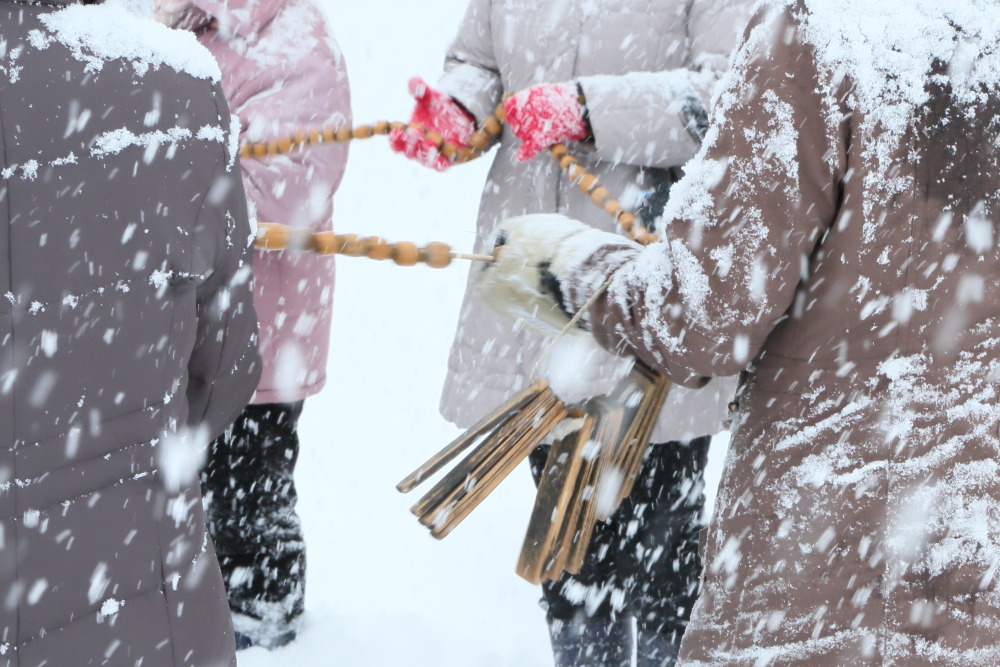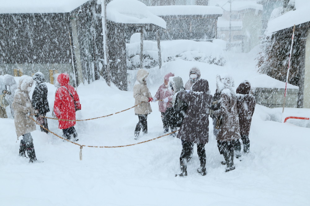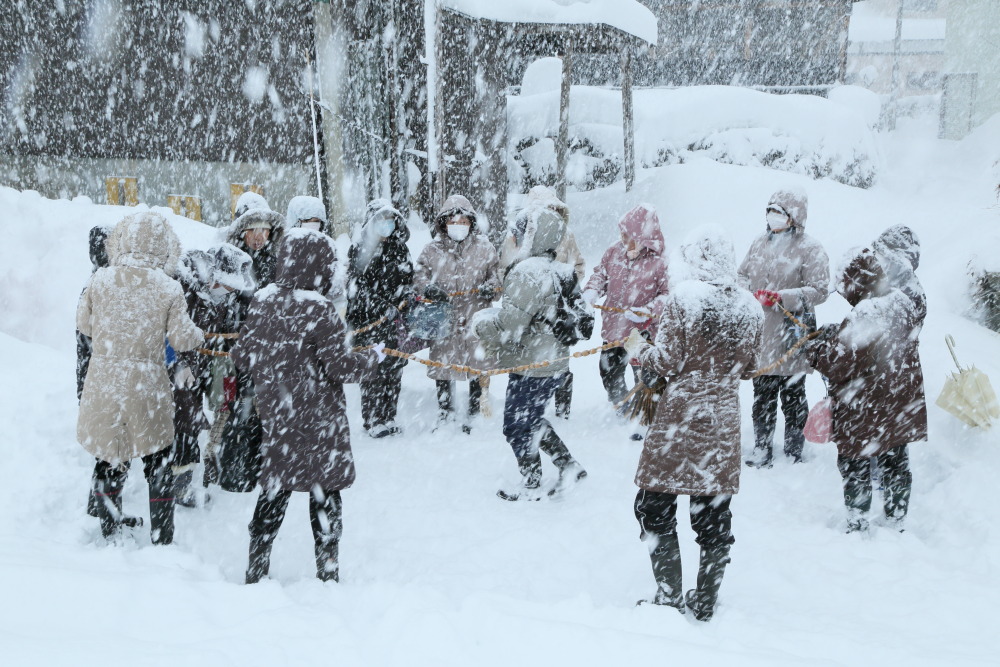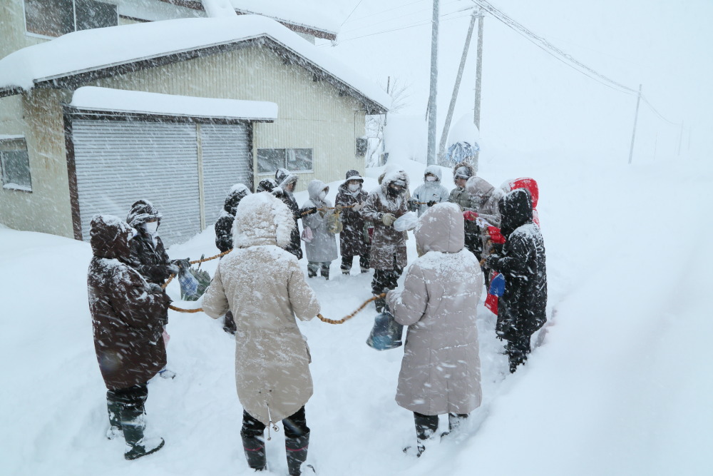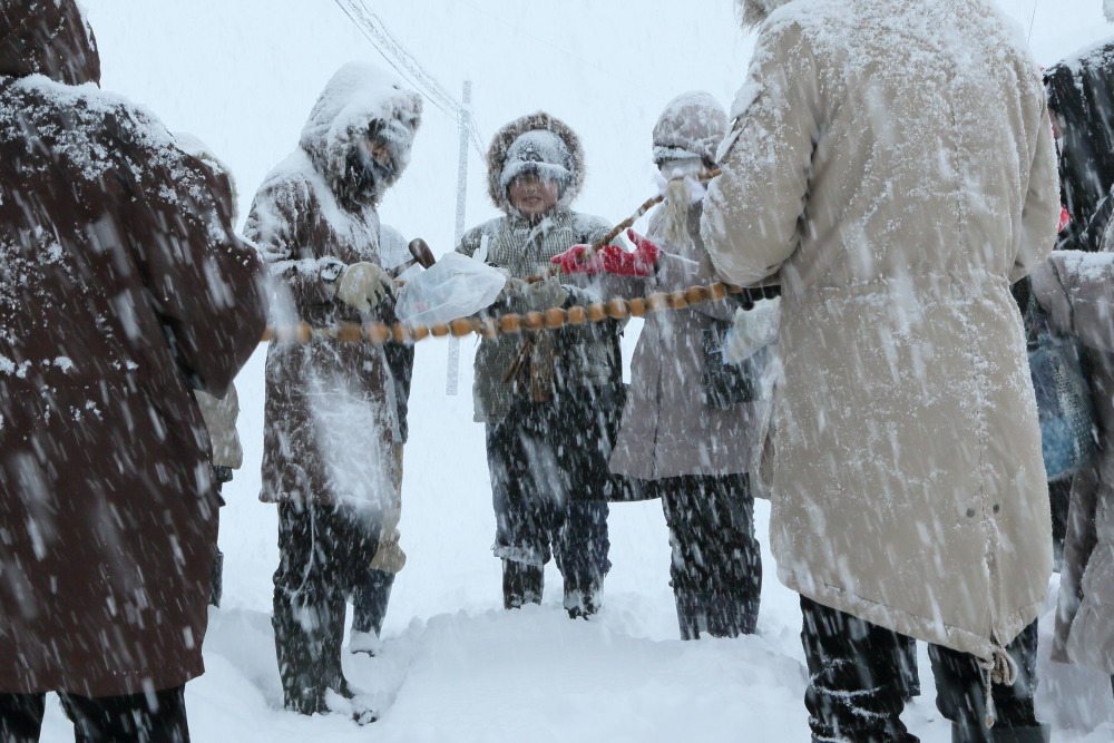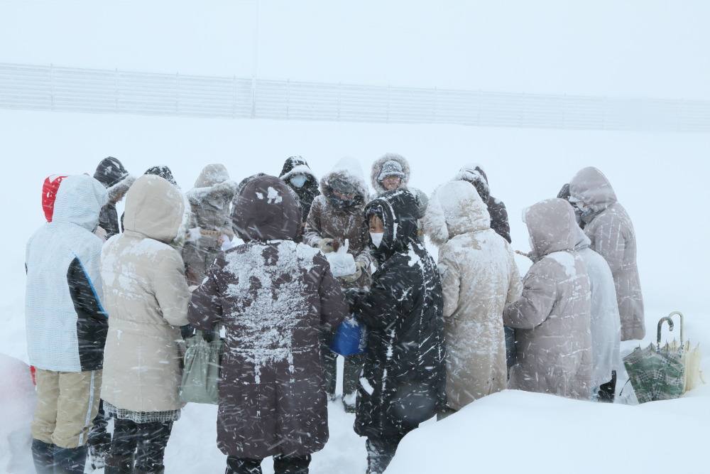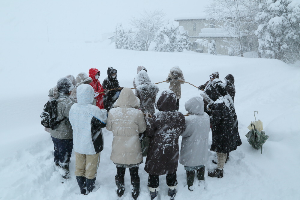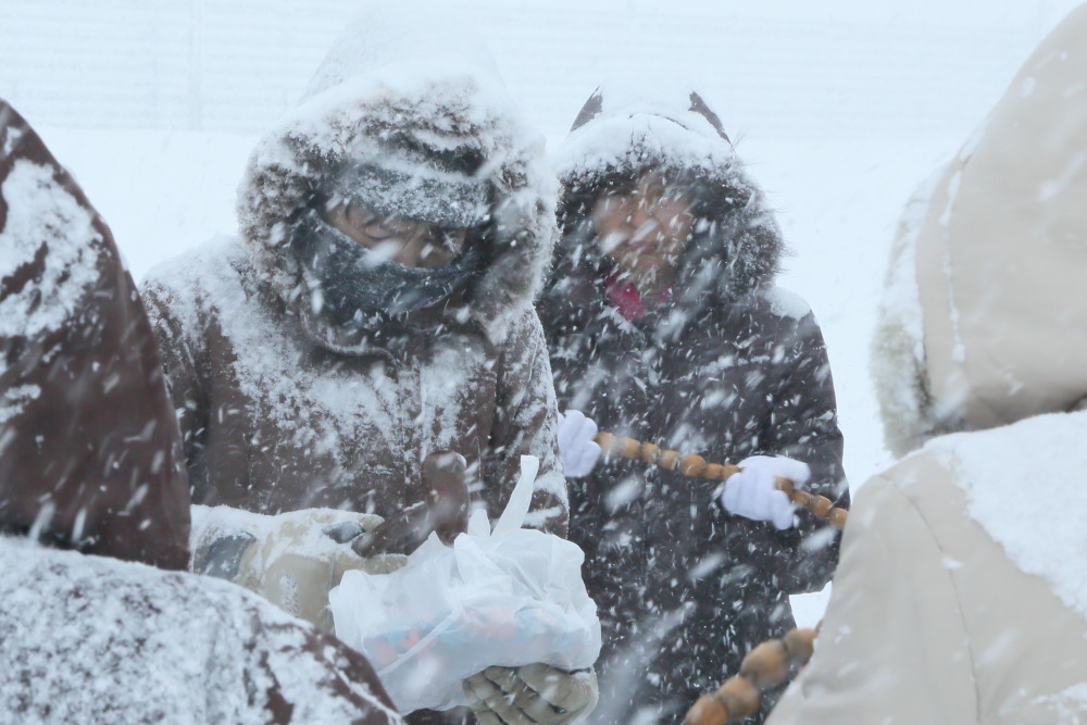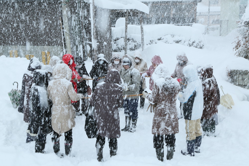 平成30年1月24日、横手は今冬最高の降雪であった。膝まである長靴が埋もれるほどの新雪で、45cmはあったようだ。そんな荒天の中、我が集落では毎年恒例の「念仏」が行われた。各家々からなぜか女性が一人ずつ参加して行う。今年は初めて写真撮影をさせてもらった。初めに念仏塚に集合し、お参りをした後で全員で(今年は20人参加)長い数珠を回す。中央で鐘をたたき続ける役の人がいて、何遍回ったかを数える役の人もいる。回す人たちはこぶ目が来ると一礼する。こうした数珠回しを集落のはずれ東西南北の入り口と庚申塚(初めにあるアイキャッチ画像)で行うのである。毎年、山内村の南郷地区で行われる百万遍念仏がTVで紹介されるが、昔はあちこちの村々で行われていたものかもしれない。寒中の素朴な雪国行事である。