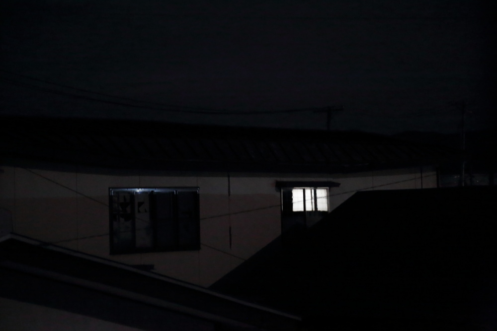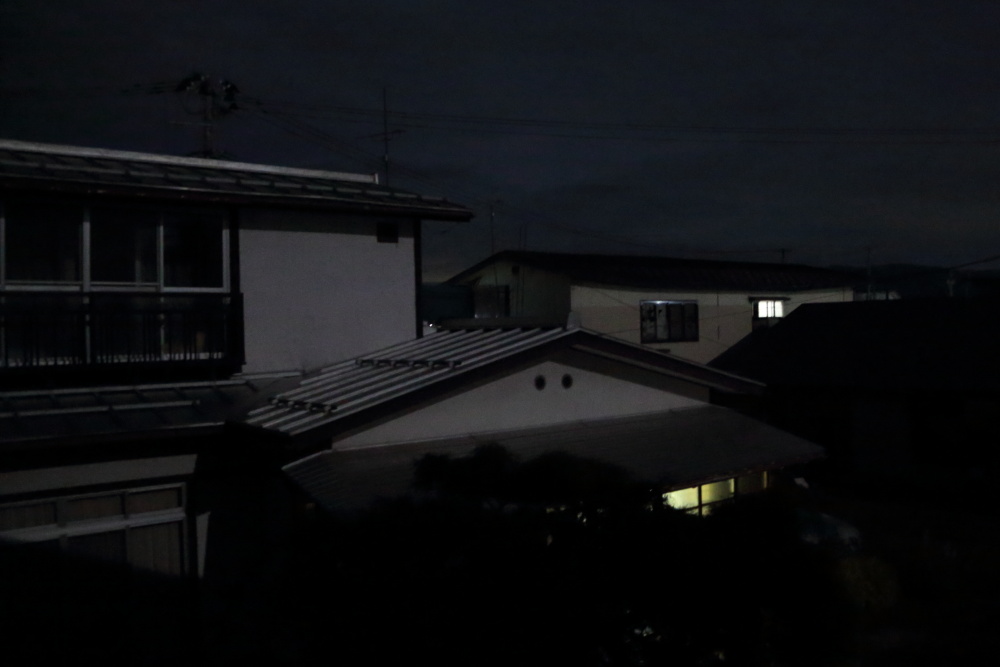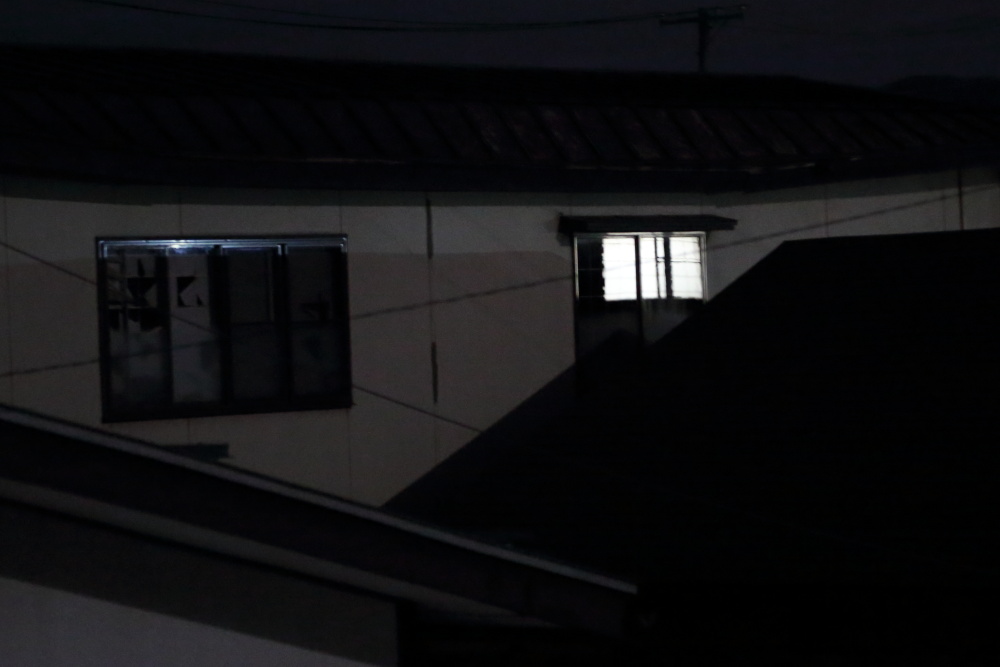 猛暑に一区切りついたかと思わせる8月19日、涼しい夜がやってきた。ようやくエアコンなしで気持ちよく寝られると、心うきうきとした夜だった。秋の夜長を思わせるすばらしい月夜である。何の気なしに、北側にあるギターの部屋の窓辺へ行って、驚いた。二軒隣にある空き家の二階に、電灯が煌々と灯っていたのだ。ここは一人暮らしであった同級生の家である。彼は数年前に他界し、その家は今は無人である。南側に窓が2か所あり、一番東側にある窓だけが明るいのであった。なんという不思議なことだろうと、慌てて写真を撮った。夜間の撮影なので、ISO感度を限度の3200まで上げて、なんとか撮り終えた。とは言え、不思議なことに変わりはない。